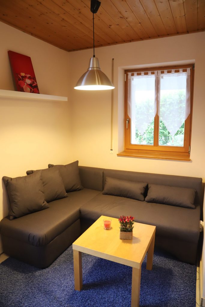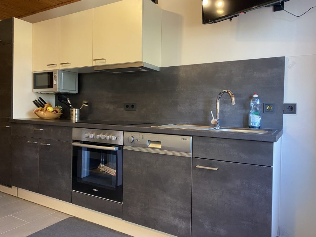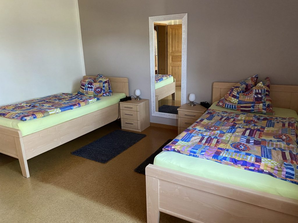 Galerie Schlafzimmer mit zwei Einzelbetten Bad Essbereich Wohnbereich Küchenbereich Badezimmer Terrasse Garten